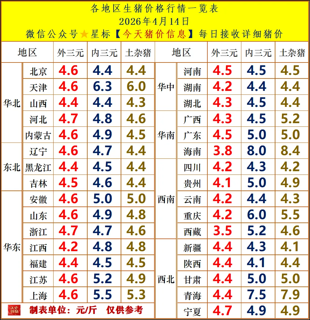 今日猪价 | 2026.4.15明天猪价最新信息!2026年04月14日猪价行情:全国综合均价4.39元/斤 外三元:4.40元/斤,较昨日下跌0.01元 内三元:4.50元/斤,较昨日下跌0.04元 土杂猪:4.51元/斤,较昨日下跌0.01元