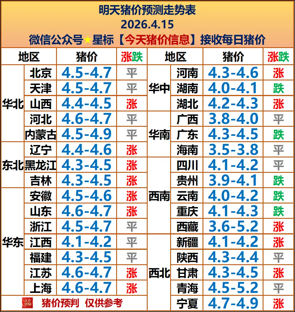 明日猪价2026年.4.15全国生猪价格表