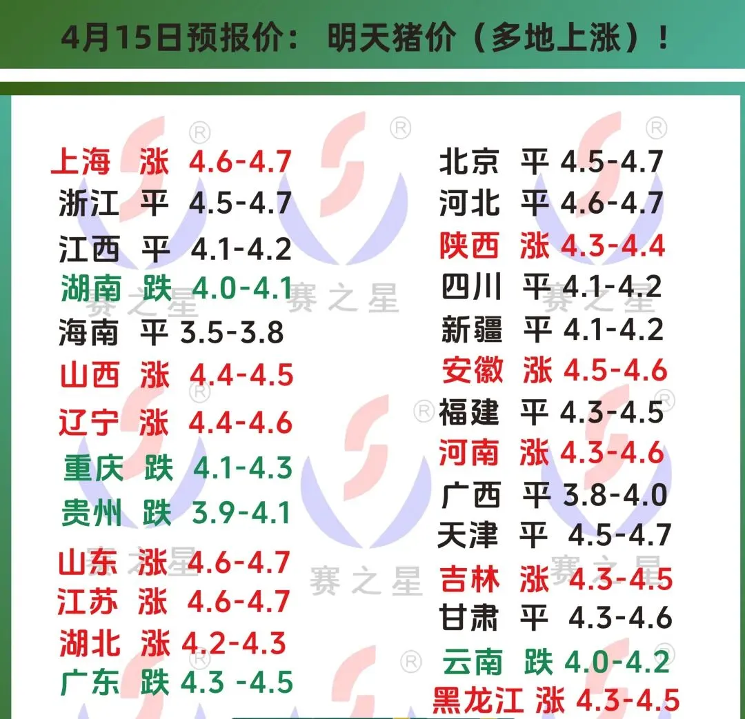 4月15日最新猪价 养羊网 2026-04-14 4月15日最新猪价 养羊网 2026-04-14 上一篇:4.15明日猪价早知道,4.15全国猪价行情信息参考 下一篇:明日猪价4月15日 您可能还会对下面的文章感兴趣111: 相关文章 妹妹撩的哪是头发 怎么毛崽子们洗澡这么贵了呀 2月6日云南昆明鸡蛋价格参考 小心!有人在奥克兰超市调换高低价鸡蛋!