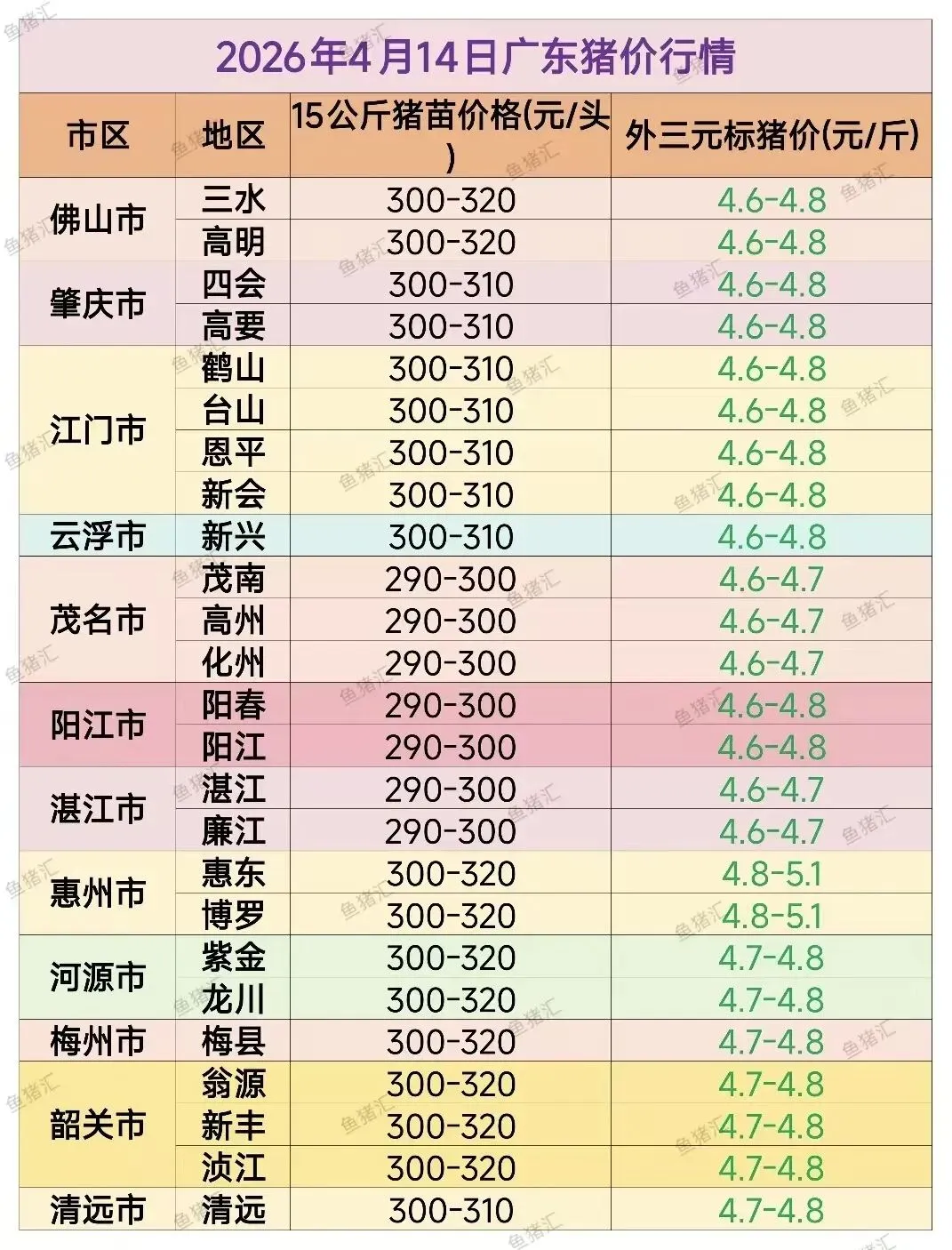 4月14日猪价速递 养羊网 2026-04-14 4月14日猪价速递广东猪苗报290~320元,毛猪报4.6~5.1元,全省各地区价格微升0.1元。(行情仅供参考) 养羊网 2026-04-14 上一篇:2026.4.15-全国猪价 下一篇:河南·南阳硕宝合作社鸡蛋价格[2026年4月14日] 您可能还会对下面的文章感兴趣111: 相关文章 曝光这个骗子!! 出鸡蛋, 二师兄不等我 2026.4.14明日猪价