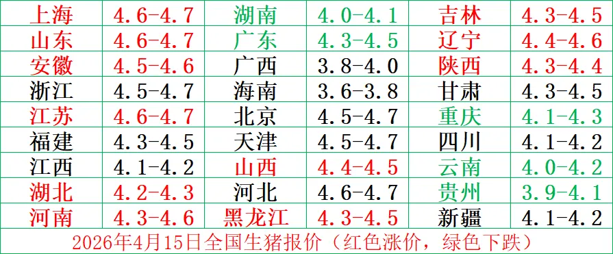 2026年4月15日猪价 养羊网 2026-04-14 2026年4月15日猪价 养羊网 2026-04-14 上一篇:【超前猪价大预测】4月16~4月18日!全国猪价 下一篇:4月15日猪价|速看!(仅供参考,关注转发!) 您可能还会对下面的文章感兴趣111: 相关文章 2025年4月13日全国各地生猪价格信息 2025年10月25日鸡蛋价格行情参考 2025年4月13日全国各地生猪价格信息 【明天猪价】2026.3.20又崩了!全国均价跌入4元区!只供参考