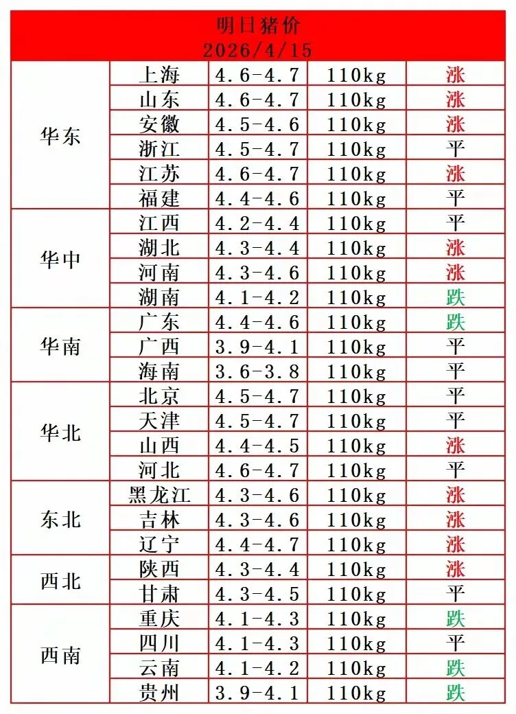 4月15日生猪价格迎来小幅反弹,行情呈现“北涨南跌”的鲜明分化格局:东北地区全面飘红,北方多数区域跟涨,南方则陷入下跌,市场区域差异显著。
