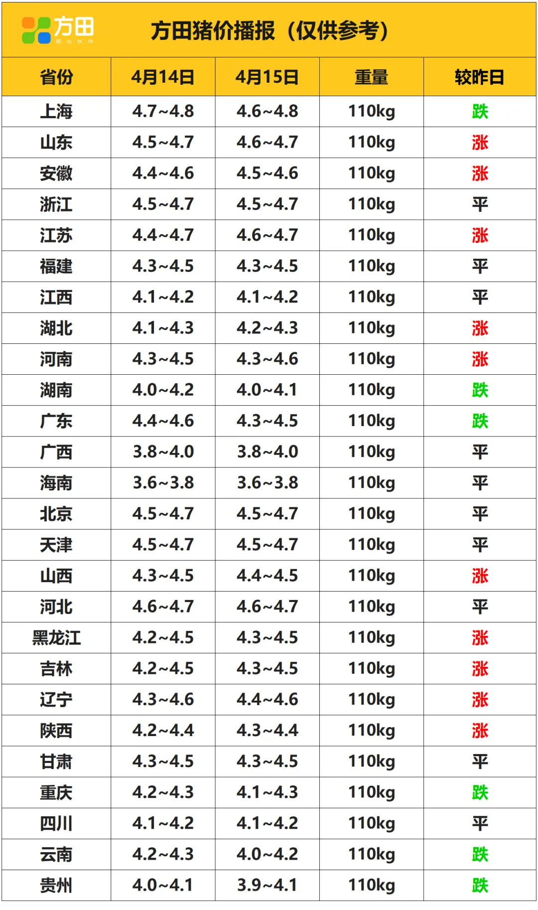 猪价丨4月15日 明日猪价早知道 养羊网 2026-04-14 猪价丨4月15日 明日猪价早知道 养羊网 2026-04-14 上一篇:2026 . 04.15 猪价 下一篇:4月猪价走势,恐慌性出栏,猪价进一步下跌 您可能还会对下面的文章感兴趣111: 相关文章 02.24明日猪价早知道,02.24全国最新猪价信息,跌!跌!跌! 明天(3月31日)猪价速览 【明天猪价】2月27日全国猪价趋稳调整! 一张图了解三大猪企