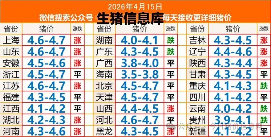 涨价26.04.15猪价 养羊网 2026-04-14 涨价26.04.15猪价 养羊网 2026-04-14 上一篇:2026.04.15-明天猪价 下一篇:明日猪价——2026年04月15全国生猪价格! 您可能还会对下面的文章感兴趣111: 相关文章 3月11日绿壳鸡蛋价格,粉三鸡蛋价格参考;高温高湿,鸡蛋存储难度增加. 2025年4月13日全国各地生猪价格信息 明日最新猪价2026.02.09 生猪价格承压,单边下跌!附:4月12日猪价