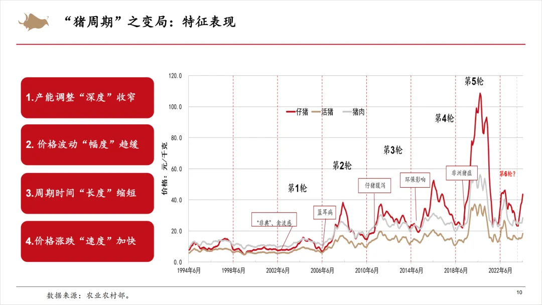 随着规模化水平的提升,生猪行业稳定性逐渐增强,生猪产能将会长期处于饱和的状态,很难过度去化。“猪周期”也出现了一些新特征:首先,产能调整“深度”收窄。“猪周期”将不会像过去一样,在行业低迷的时候因叠加动物疫病因素而被迫去产能,使得产能去化的“深度”加深。随着规模化水平提升,大量散养户的退出,减少了其对全国总体生猪行业产能的影响。第二,价格波动“幅度”趋缓。目前处于自然生长周期,产能去化幅度不会特别大,对应的猪价涨跌的幅度趋缓。第三,周期时间“长度”缩短。2022-2024年,第六轮猪周期仅持续了两年,就是由于产能调整很灵敏,没有发生在行情上涨的时候,因突然发生动物疫病而被迫去产能的情况。第四,价格涨跌“速度”加快。市场信息透明度提高是一把双刃剑,能够指引大家的同时也会让一部分人更加有信心做“投机式”养猪。二次育肥、极端压栏会让市场行情出现阶段性的“不该涨的时候猪价上涨,该涨的时候猪价反而一路下跌”现象,2022年就是典型的代表。