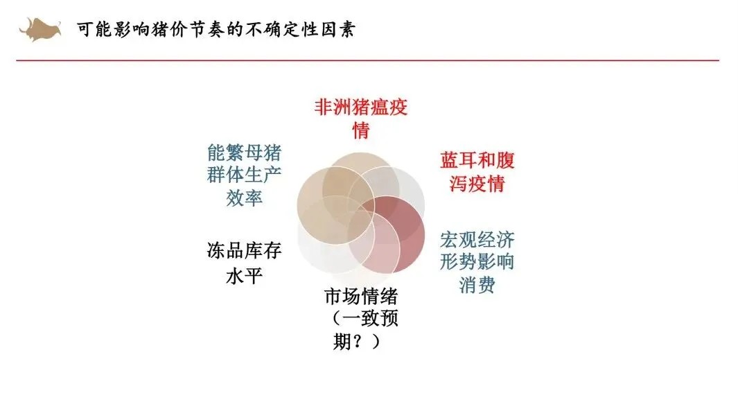 此外,还有不确定因素可能带来的影响,比如说猪病疫情、消费问题,以及能繁母猪生产效率提升等问题。他强调,如果今年大家依然能够保持谨慎的情绪,即使接下来的几个月供应可能会有小幅度的增长,但消费增长的幅度可能会比供应增长的幅度更大,年底前猪价没有大幅度下跌的风险。