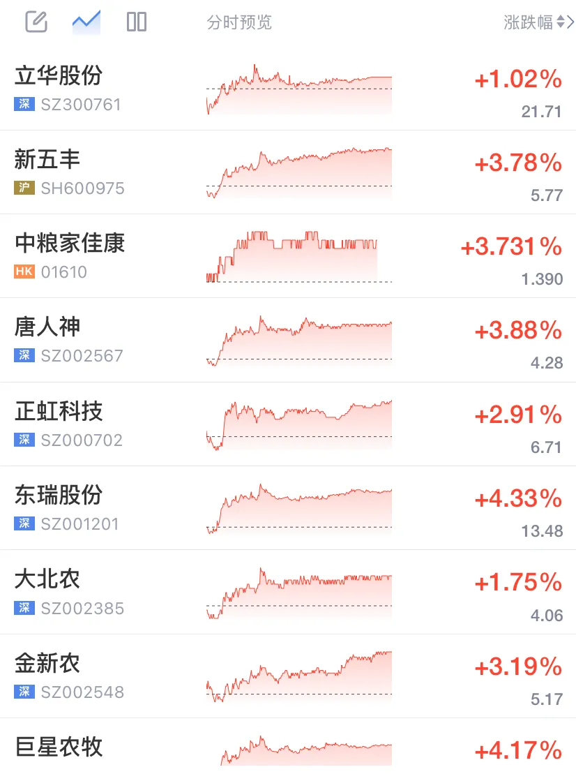 当下猪价低到什么程度呢?“菜比肉贵”一度冲上热搜,而连续9周的狂跌,让猪价连葱姜蒜也拼不过了。据国家发改委的最新数据,4月第2周猪粮比价为3.97:1,也跌破了4!连续10周环比下降,并且连续4周创下7年来新低。 据猪场动力网监测,今日120公斤-130公斤标猪均价为8.59元/公斤,较昨日再小幅下跌0.02元/公斤。 其中,虽然19个省份的猪价暂时稳住了,还有3个省份的猪价有小幅反弹0.05-0.10元/公斤,但值得重点关注的是,又有湖南、贵州两个省份先后在2日内跌进了3元线,最低价都降至3.9-3.95元/斤左右! 另外,根据农业农村部监测,4月第1周的定点屠宰价格为11.40/公斤,白条肉出厂价格为15.19元/公斤,继续环比同比双跌,现货市场量价双弱,供需失衡还在持续。 与现货市场截然不同的是,这两天养殖板块突然“异常火热”,呈现集体拉涨态势。 从昨日起,猪肉概念股板块再次异动,截至今日,板块上涨1.83%,涨幅居板块前列。个股方面,33只猪肉股全线大涨,天邦食品两连板、正邦科技涨停,傲农生物涨超6%,神农集团、天康生物涨超4%,牧原股份、新希望、巨星农牧、唐人神、东瑞股份等多股跟涨超2%。