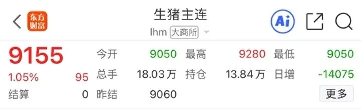 而期货市场也迎来久违的反转。昨日,生猪期货盘中一度下探至9000元/吨的新低点,而截至4月14日午盘,生猪期货主力合约低开高走涨超1%,最新报价9155元/吨。