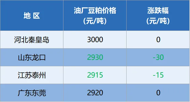 今日全国重要地区油厂豆粕(43%蛋白)价格