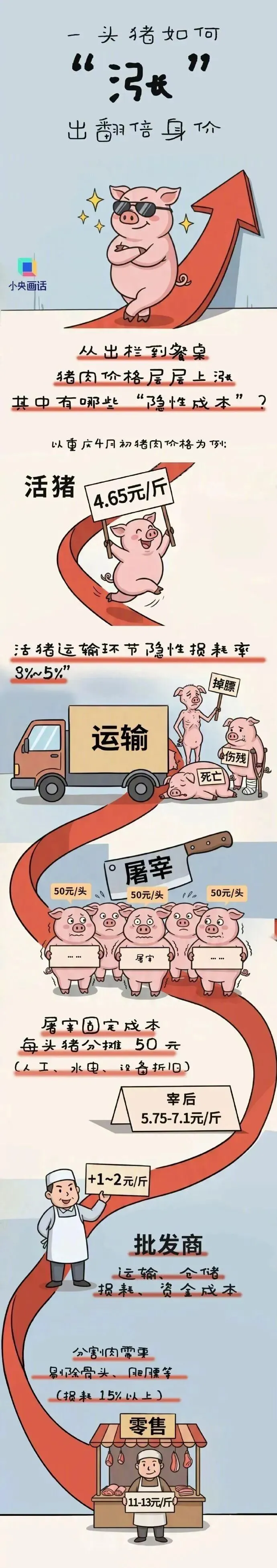 问题,从第一刀就已经开始。 一头猪,从活体变成餐桌上的肉,首先要经过一个关键环节——屠宰加工行业。 很多人忽略了一个事实: 猪不是“按斤卖肉”的,而是“整头处理”的。 一头活猪,出肉率大约在70%左右。也就是说,1斤活猪,并不能变成1斤可售卖的肉。 当生猪价格是5元/斤时,折算到“可用肉”,成本已经接近7元甚至更高。 再加上检疫、人工、水电、设备折旧,这一步,成本就已经被抬上去了。 但这还只是起点。 接下来,是运输和流通。 从屠宰场到城市批发市场,再到各个零售终端,每一段都离不开冷链、仓储、损耗。 油价、电费、人工——这些都不会因为“猪便宜了”而下降。 于是,每斤肉,在流通过程中,再被叠加1到2元的成本。
