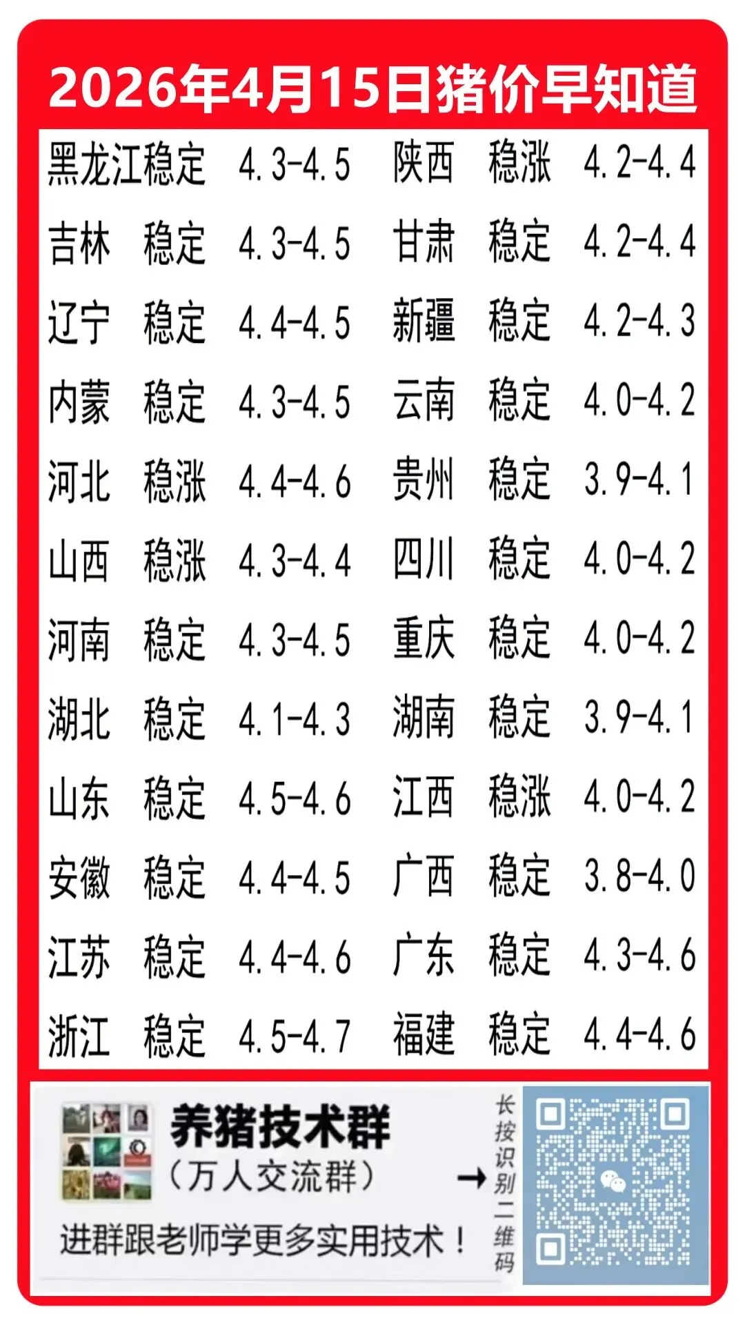猪价尝试拉涨!2026年4月15日多省猪价稳中有涨!! 养羊网 2026-04-14 猪价尝试拉涨!2026年4月15日多省猪价稳中有涨!! 养羊网 2026-04-14 上一篇:2026.4.15明日猪价(基层明日猪价!) 下一篇:猪价终于上涨了!2026.4.15明日猪价,猪价略有反弹 您可能还会对下面的文章感兴趣111: 相关文章 2025年4月13日全国各地生猪价格信息 畜牧养殖宠物大类实习生招募 近期价格更新!!! 【明天猪价】 2026.3.27日全国猪价