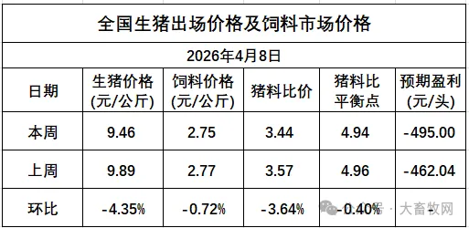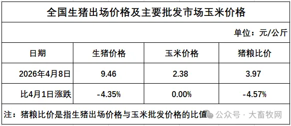 发改委价格监测中心发布2026年4月第2周猪粮比及猪价分析情况,本周全国生猪价格为9.46元/公斤,环比下跌4.35%,连续2周跌破10元大关,连续10周环比下跌,连续7周创2019年以来最低价;玉米价格为2.38/公斤,与上周持平;猪粮比价为3.97,环比下降4.57%,跌破4,连续10周环比下降,连续4周创下2019年以来新低。