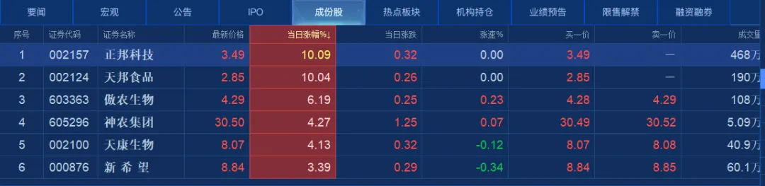 截至早间收盘,板块表现亮眼,个股普涨:天邦食品率先封板,大禹生物、正邦科技等多只个股走高,巨星农牧、大禹生物等涨幅超 4%,牧原股份等龙头同步跟涨。