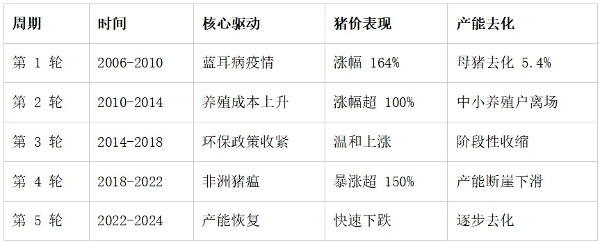 老股民都听说过“猪周期”——一个典型的“上涨→下跌→筑底→复苏”循环,过去20年已完整经历了5轮。每一轮周期的核心驱动不同,但大致规律是:猪价大涨→养殖户扩产→供给过剩→猪价大跌→养殖户减栏→供给收缩→猪价回升,循环往复。