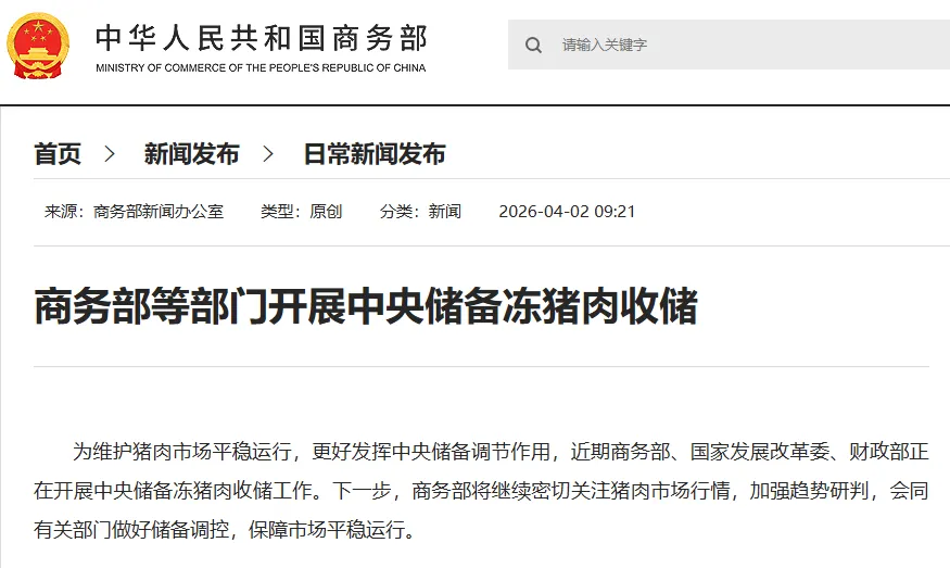 4 月 2 日三部委启动今年第二批中央储备冻猪肉收储(1 万吨),叠加 3 月初第一批,累计收储 2 万吨。虽规模有限、以信号意义为主,但有效遏制猪价无序下跌,缓解行业恐慌性抛售。