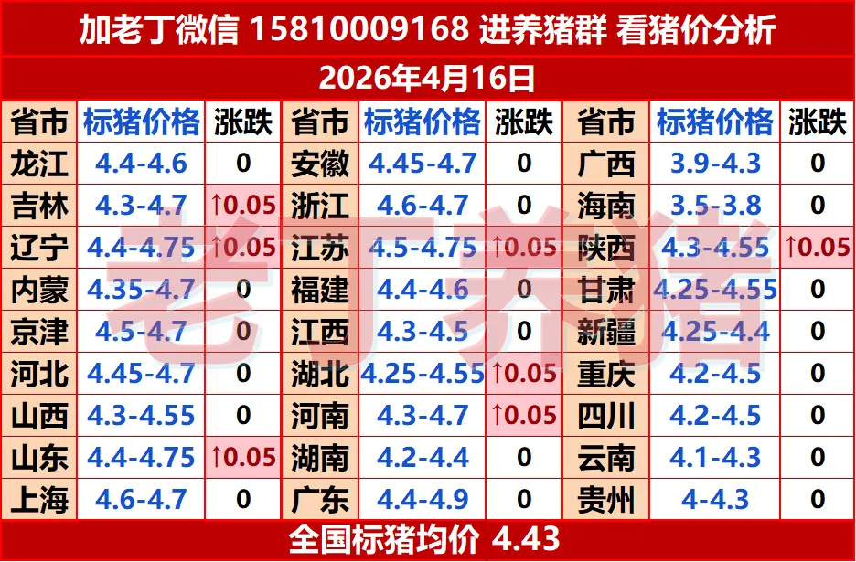 猪价有涨!【明天猪价】4月16日全国猪价涨跌表! 养羊网 2026-04-15 猪价有涨!【明天猪价】4月16日全国猪价涨跌表! 养羊网 2026-04-15 上一篇:养羊压得我喘不过气,我发现了一个解压法子 下一篇:从28年前的M国猪价灾难带来的思考 您可能还会对下面的文章感兴趣111: 相关文章 今日鸡蛋价格大涨(2026年4月10日)蛋价未来15天预测 养羊人常用的几种退烧药品,都有哪些特点和区别? 衢州原种母猪价格 小羊羔为什么会长这么胖?一个老养羊人的育肥方子,请大家指正
