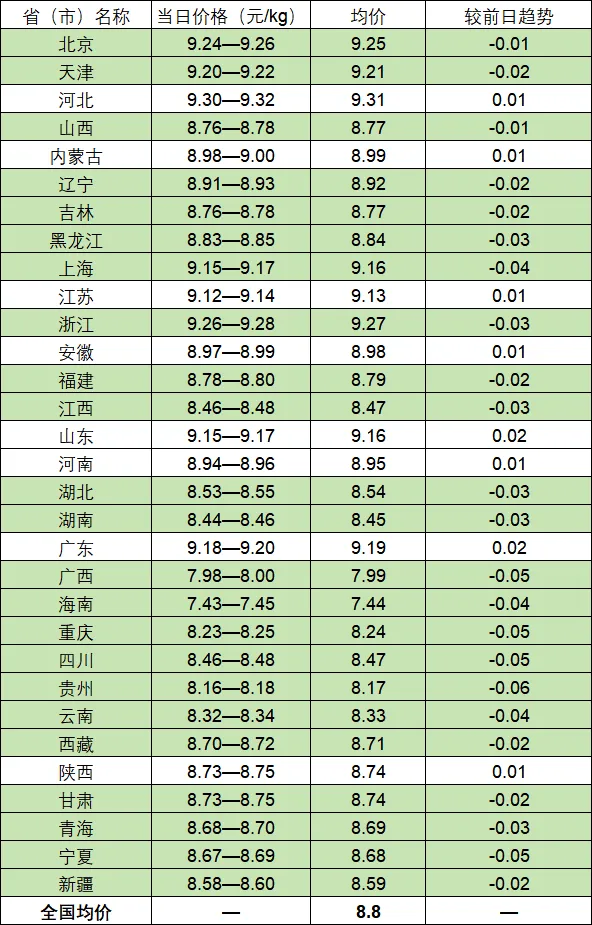? ? ?4月15日全国猪市延续低位震荡格局,供需博弈加剧,区域分化特征显著。据农业农村部及权威行业平台监测,当日全国外三元毛猪均价8.80元/kg,较前日微跌0.02元/kg;瘦肉型白条肉批发均价16.05元/kg,较前日下跌0.18元/kg,整体延续“供强需弱”的基本面,但局部地区因出栏节奏与需求差异出现小幅反弹。