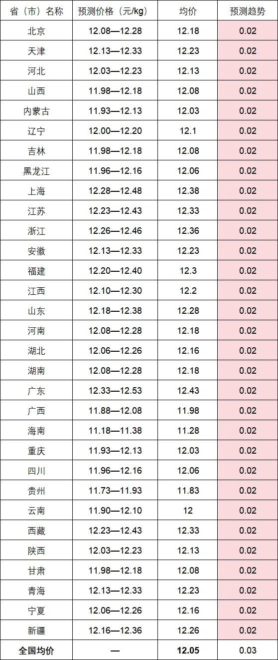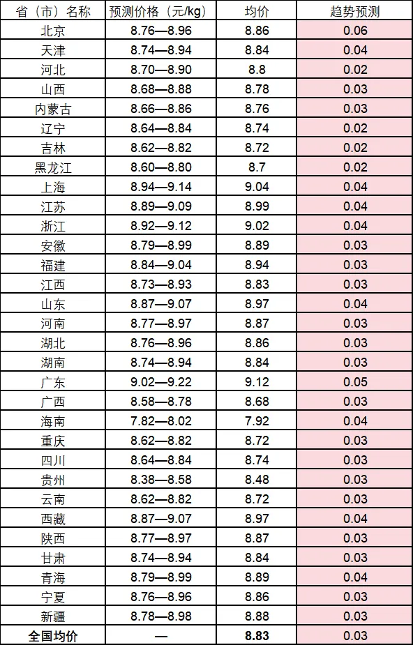 二、全国各省(市)白条肉批发交易价格行情预测表