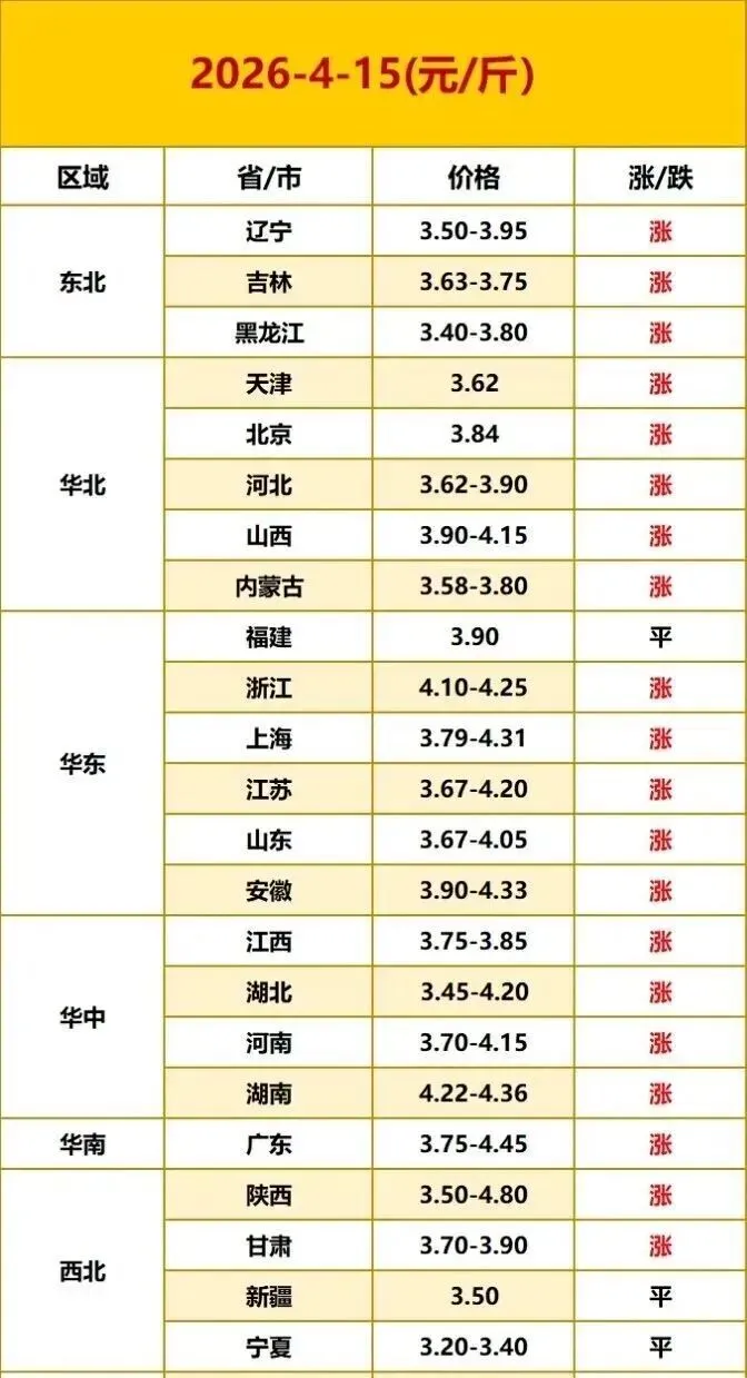 2026.4.15明日最新鸡蛋价格! 养羊网 2026-04-15 2026.4.15明日最新鸡蛋价格!蛋价日评:今日鸡蛋价格上涨。五一节前备货提前启动,走货加快、库存偏低,养殖户惜售情绪显现,但在产蛋鸡存栏仍处高位,换羽鸡陆续开产,供应压力制约涨幅。养殖端接近盈亏平衡,饲料成本提供底部支撑。预计短期蛋价将维持震荡偏强。 养羊网 2026-04-15 上一篇:【明日猪价】4月16日(猪价大涨、暴涨就要来了!全国猪价马上开启新一轮上涨) 下一篇:贵州百顺集团鸡蛋价格:4月15日;继续上涨!!! 您可能还会对下面的文章感兴趣111: 相关文章 第39篇:什么是【猪周期】? 2025年4月13日全国各地生猪价格信息 2026.4.13 明日猪价多地上涨! 3月5日猪价