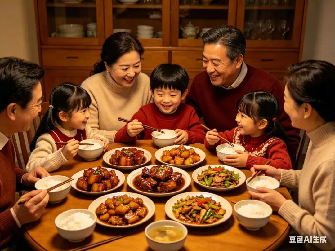 家庭餐桌摆着红烧肉、小炒肉等猪肉菜品,一家人开心用餐