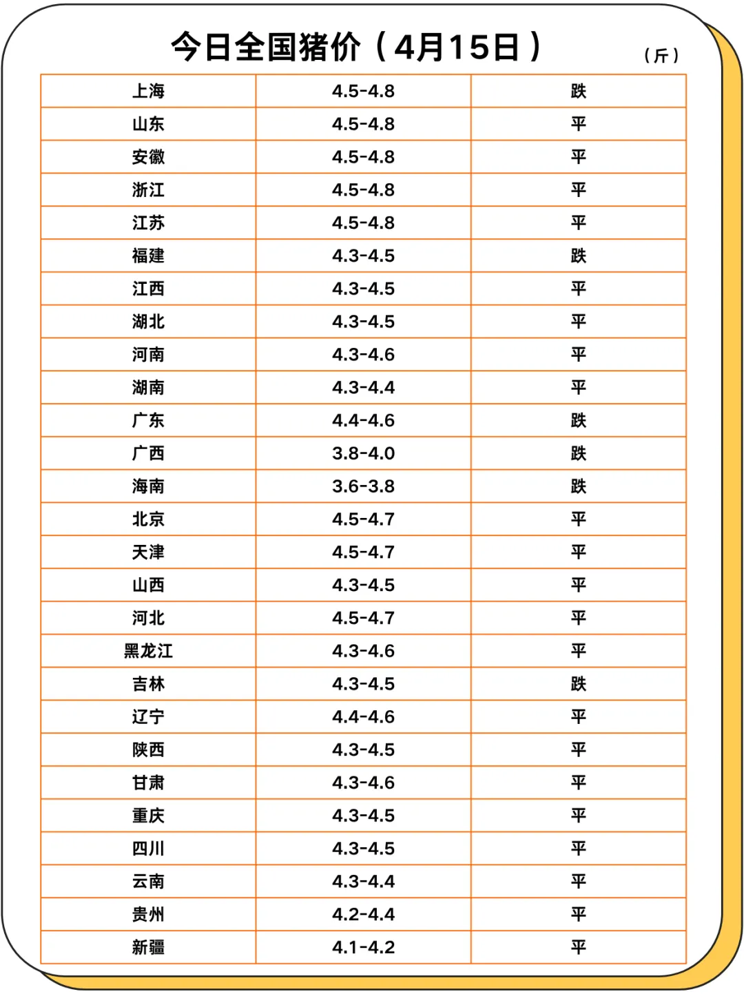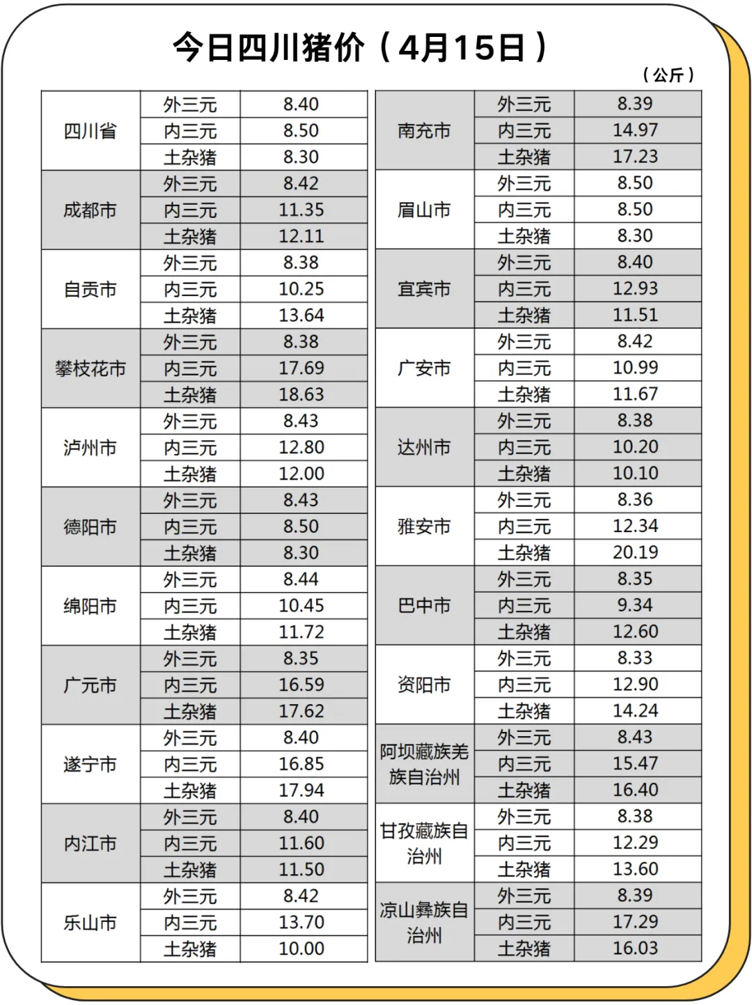 4月15日四川各地区猪价和全国各省猪价情况表 养羊网 2026-04-15 4月15日四川各地区猪价和全国各省猪价情况表 养羊网 2026-04-15 上一篇:昆明涨:4月15日昆明鸡蛋价格参考,云南鸡蛋价格参考; 下一篇:粉三继续涨:4月15日绿壳鸡蛋价格,粉三鸡蛋价格参考 您可能还会对下面的文章感兴趣111: 相关文章 2026年1月20日最新鸡蛋价格 4.2全国最新猪价信息 汀香郡北区物业真的好! 在周口终于买到了想要的:本地山羊筒子?