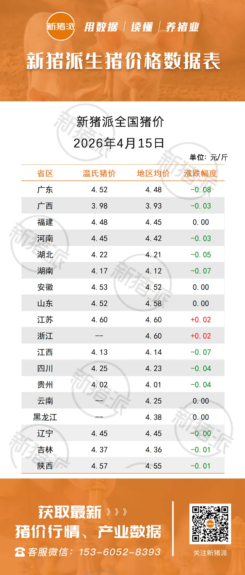 4月15日:全国猪价持续走弱,广西猪价跌破4元,广东领跌0.08元/斤【新猪派·指数】