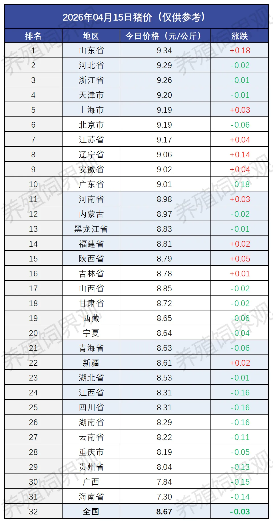 目前全国最高价为山东省,价格为9.34元/公斤,较昨日上涨0.18元/公斤;全国最低价为海南省,价格为7.30元/公斤,较昨日下跌0.14元/公斤。