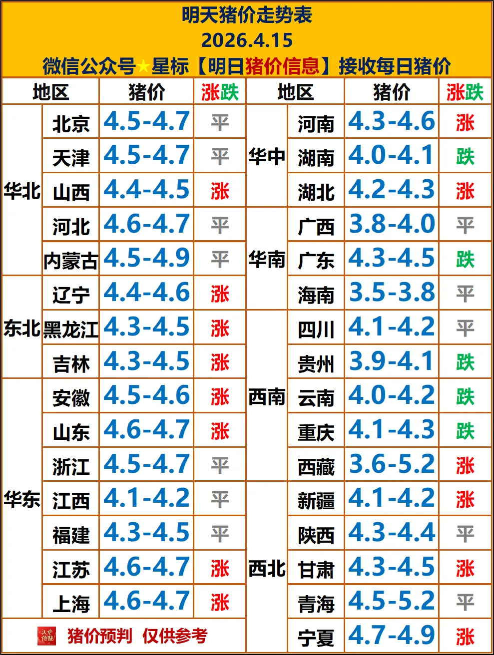 今日猪价 | 2026.4.14,明天猪价走势! 养羊网 2026-04-15 今日猪价 | 2026.4.14,明天猪价走势!4 月 15 日全国猪价整体偏弱运行,呈现北跌南稳、局部小幅波动格局。北方多地因出栏积极性增加,价格小幅下调;南方市场受惜售情绪支撑,价格相对平稳。当前消费依旧偏淡,五一节前备货尚未明显发力,猪价仍在低位震荡整理,短期大涨动力不足,整体以窄幅调整为主。 养羊网 2026-04-15 上一篇:2026.4.15猪价快讯--福州穗丰动保 下一篇:猪价分析:小幅上涨 您可能还会对下面的文章感兴趣111: 相关文章 生猪行业大地震!国家三连重拳出击 3月24日浙江省猪价日报 4月14日浙江省猪价日报 带爸妈吃了3次的贵阳清水烫,终于说对了!