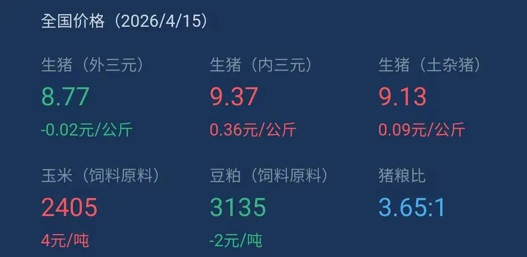 一、今天(2026年4月15日)全国生猪标准体重平均价格8.7-9.3元/公斤,同比昨日(2026年4月14日)价格上涨0.05元/公斤。