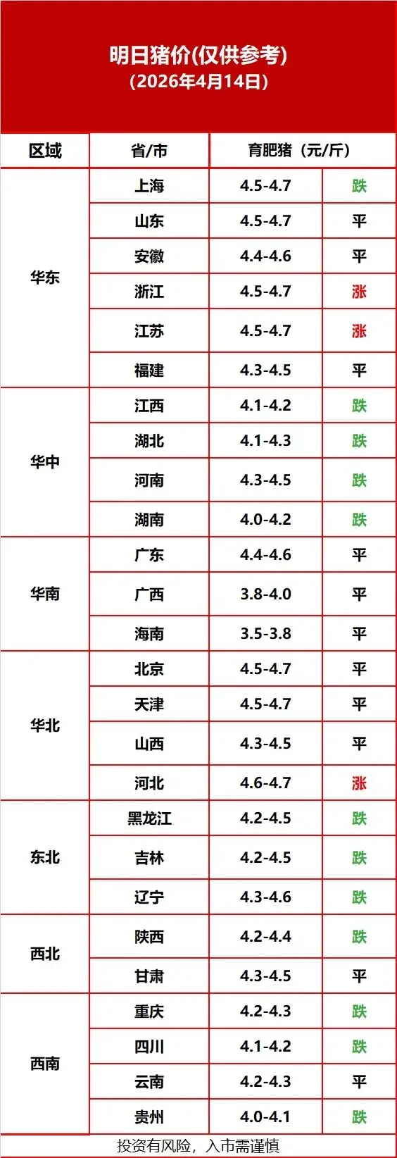 【今日猪价】4月14日全国猪价:整体延续偏弱走势,再创年内新低,行业亏损加剧 养羊网 2026-04-15 【今日猪价】4月14日全国猪价:整体延续偏弱走势,再创年内新低,行业亏损加剧 养羊网 2026-04-15 上一篇:粤东生猪价格|4月15日最新猪价及未来三天预测 下一篇:2026年4月15日共青城鸡蛋价格优源商行提供.仅供参考! 您可能还会对下面的文章感兴趣111: 相关文章 2025年4月13日全国各地生猪价格信息 0323-鸡网鸡蛋价格早报 今天鸡蛋价格继续上涨! 【聊一聊】猪价的底部还有多远?