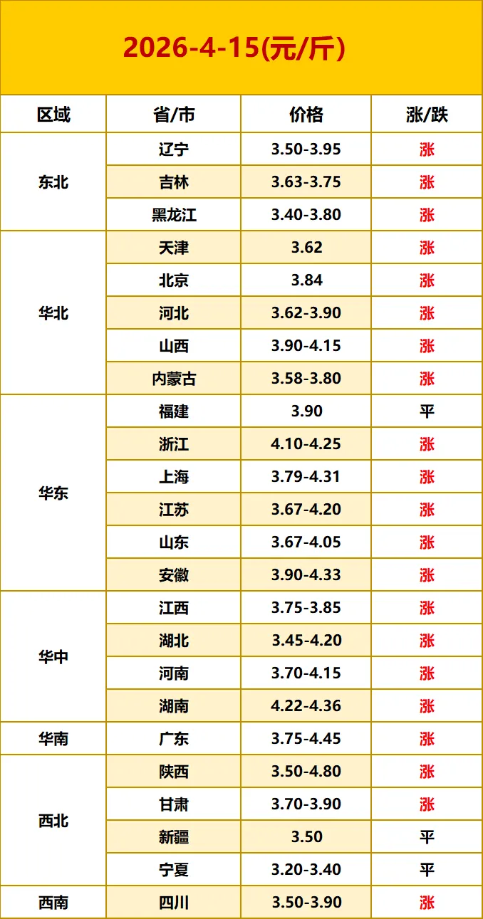 2026.4.15 今日鸡蛋价格 养羊网 2026-04-15 2026.4.15 今日鸡蛋价格蛋价日评:今日鸡蛋价格上涨。五一节前备货提前启动,走货加快、库存偏低,养殖户惜售情绪显现,但在产蛋鸡存栏仍处高位,换羽鸡陆续开产,供应压力制约涨幅。养殖端接近盈亏平衡,饲料成本提供底部支撑。预计短期蛋价将维持震荡偏强。以上报价仅供参考! 养羊网 2026-04-15 上一篇:【猪价早报】2026.4.16全国猪价多地上涨 下一篇:2026年4月16日 鸡蛋价格 您可能还会对下面的文章感兴趣111: 相关文章 上海的高端漂亮饭,越来越便宜了 整羊特价自取 今日鸡蛋价格(2026.3.20) 全国各地明日猪价(2026.03.17)-山里香惠营