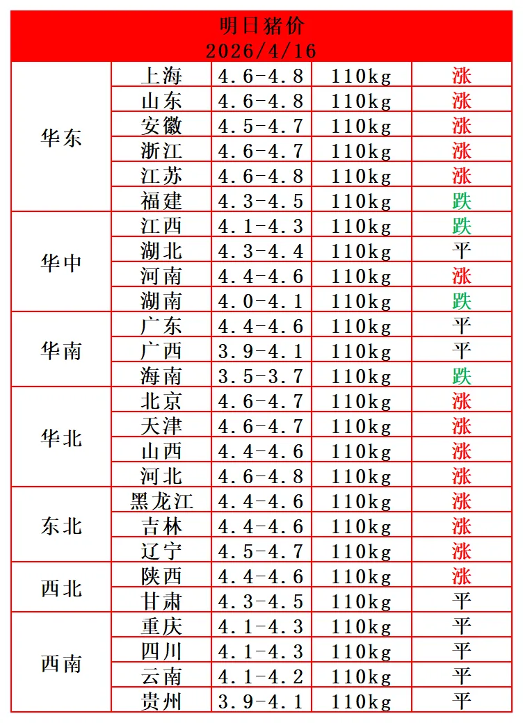2026-4-16日猪价(明日猪价) 养羊网 2026-04-15 2026-4-16日猪价(明日猪价)立马收到明日猪价! 养羊网 2026-04-15 上一篇:4.16明日猪价早知道,4.16全国猪价行情信息参考 下一篇:【明天猪价】2026.4.16全国猪价已更新) 您可能还会对下面的文章感兴趣111: 相关文章 2026年3月15日西安鸡蛋价格参考 十二万炒股实盘记录(目前144703) 跌!跌!3.12明日猪价早知道,3.12全国最新猪价信息 2025年4月13日全国各地生猪价格信息