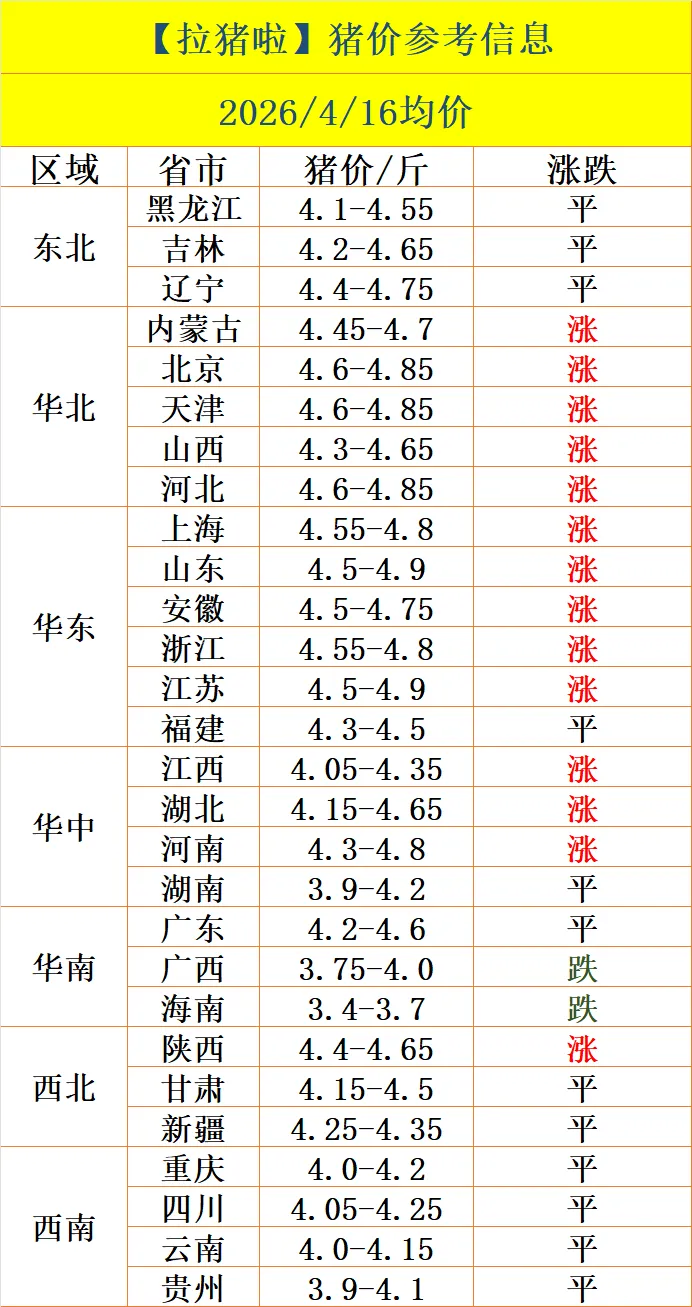 【拉猪啦】4.16-猪价行情与买卖猪信息!(多地飘红上涨!)