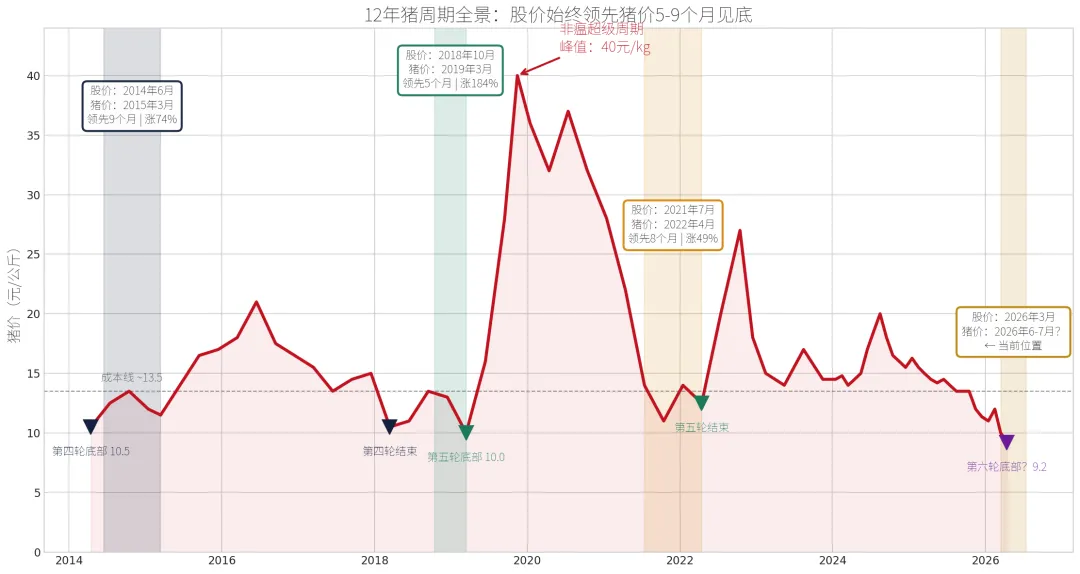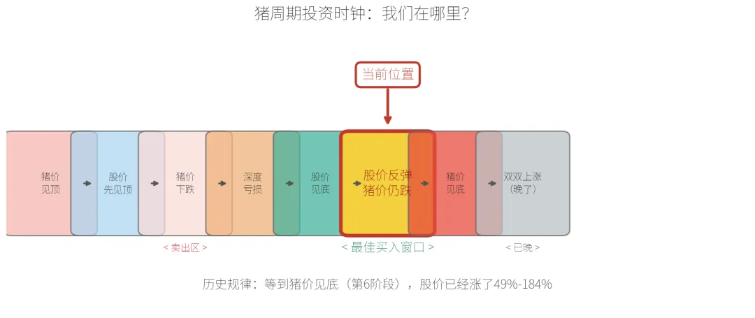 我们在"股价已见底、猪价仍在跌"的阶段。历史上,这是整个周期里回报最高的窗口。