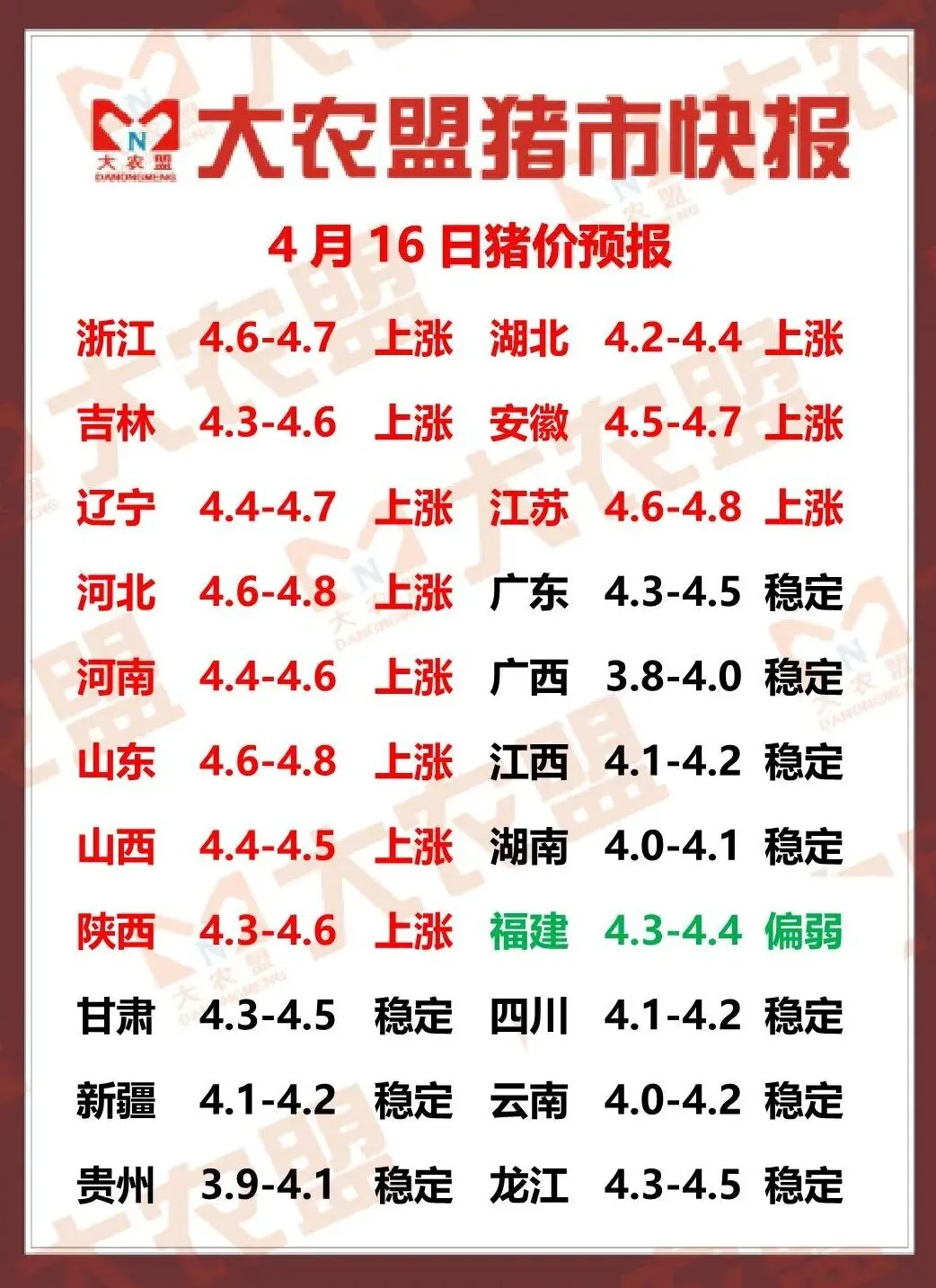 2026.04.16全国猪价信息(猪价涨价了,坐稳扶好了!)何时卖猪,扫码咨询! 养羊网 2026-04-15 2026.04.16全国猪价信息(猪价涨价了,坐稳扶好了!)何时卖猪,扫码咨询! 养羊网 2026-04-15 上一篇:2026.4.16 明日猪价多地上涨! 下一篇:图1图3:中国畜牧业协会对猪价形势的分析[调皮][调皮][调皮][调皮][调皮][调皮] 您可能还会对下面的文章感兴趣111: 相关文章 猪价大预测】2月7日~2月10日!全国猪价! 帮家人卖羊喽甘肃滩羊肉 四川老母蛋品数字农业平台1月20日 鸡蛋价格 操控性下跌 2026.3.19明日猪价(基层明日猪价!)