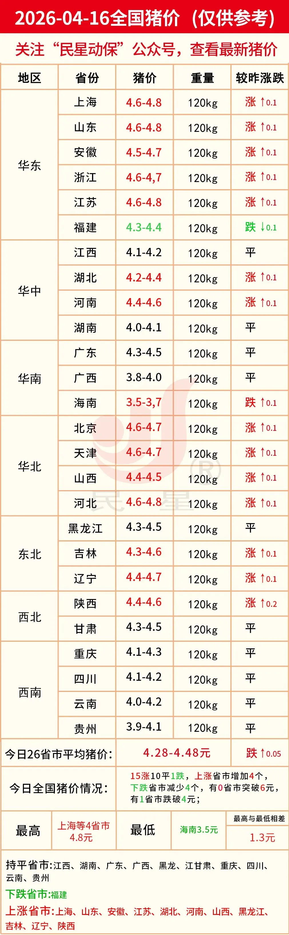 明日猪价—2026年04月16日(全国最新生猪价格)大面积上涨! 养羊网 2026-04-15 明日猪价—2026年04月16日(全国最新生猪价格)大面积上涨! 养羊网 2026-04-15 上一篇:明日(4.16)猪价资讯 下一篇:开洲九鼎 猪价播报(2026.4.16) 您可能还会对下面的文章感兴趣111: 相关文章 3.12明日猪价 2025年7月28日全国各地生猪价格信息 【今日猪价:2026.3.7】 2026年3月21日鸡蛋价格最新报价表