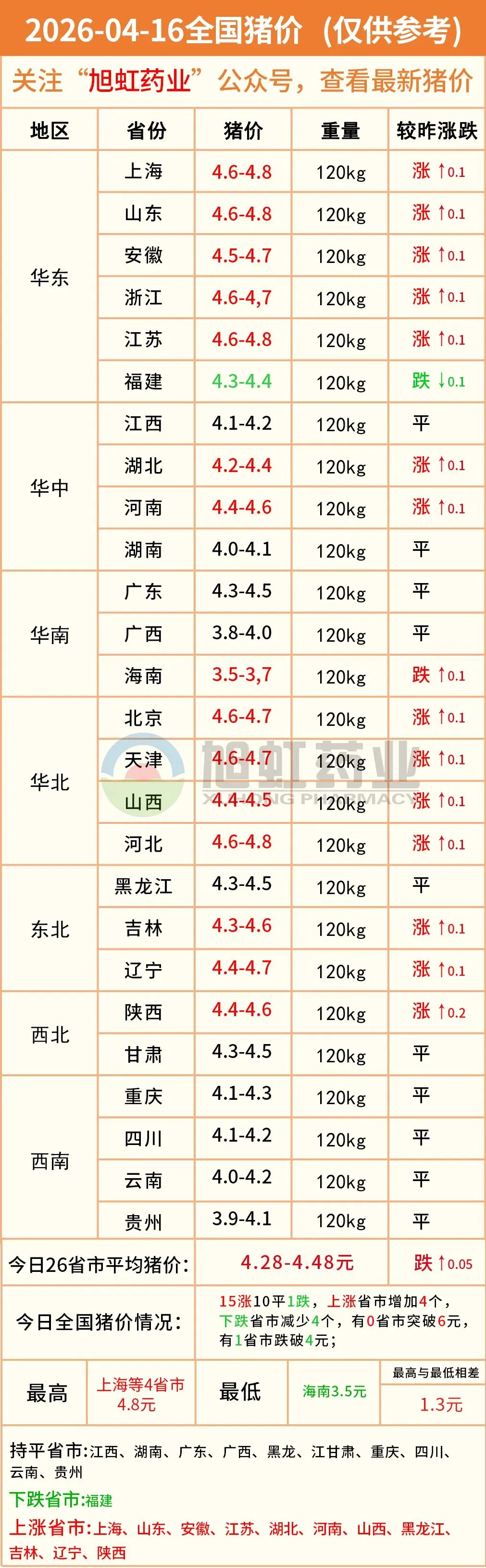 明日猪价——2026年04月16全国生猪价格! 养羊网 2026-04-15 明日猪价——2026年04月16全国生猪价格! 养羊网 2026-04-15 上一篇:快乐养殖提醒您关注2026/4/16猪价 下一篇:一周农牧渔大事件:牛蛙新规、猪价收储、饲料暴涨、温氏捐鸡……(4.15-4.22) 您可能还会对下面的文章感兴趣111: 相关文章 今日猪价|生猪综合价格2026.3.25 【猪价预测】1月24-1月27 猪价预测 第39篇:什么是【猪周期】? 猪价呈现大部上涨,市场情绪表现一般