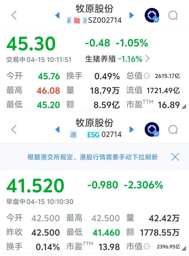 摩根士丹利则给出了更具体的判断。该行给予牧原股份增持评级,A股目标价58元,H股目标价59港元。根据当前股价(如上图),A股约有28%的上涨空间,H股则有超过?40%?的上涨潜力。