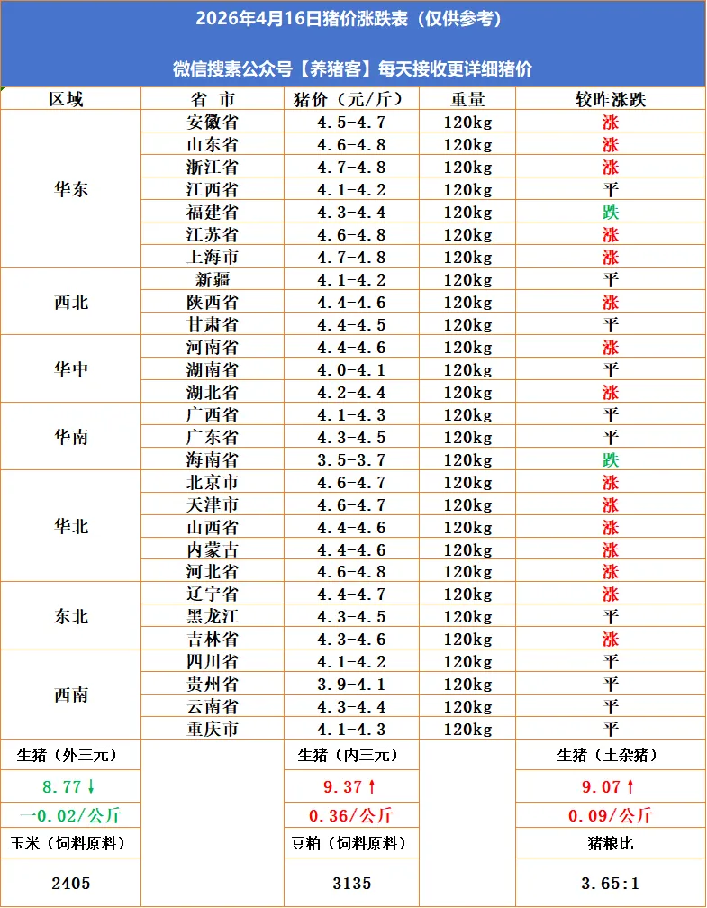 养猪客|2026.4.16|明天猪价分析(只供参考) 养羊网 2026-04-15 养猪客|2026.4.16|明天猪价分析(只供参考) 养羊网 2026-04-15 上一篇:2026.4.16明天猪价行情分析参考,分析师称下半年猪价多是反弹,难言反转? 下一篇:2026.04.16-明天猪价 您可能还会对下面的文章感兴趣111: 相关文章 公羊40公斤左右 1月7日全国早间猪价稳定为主! 猪价大预测】3月13日~3月15日!全国猪价! 2025年4月13日全国各地生猪价格信息