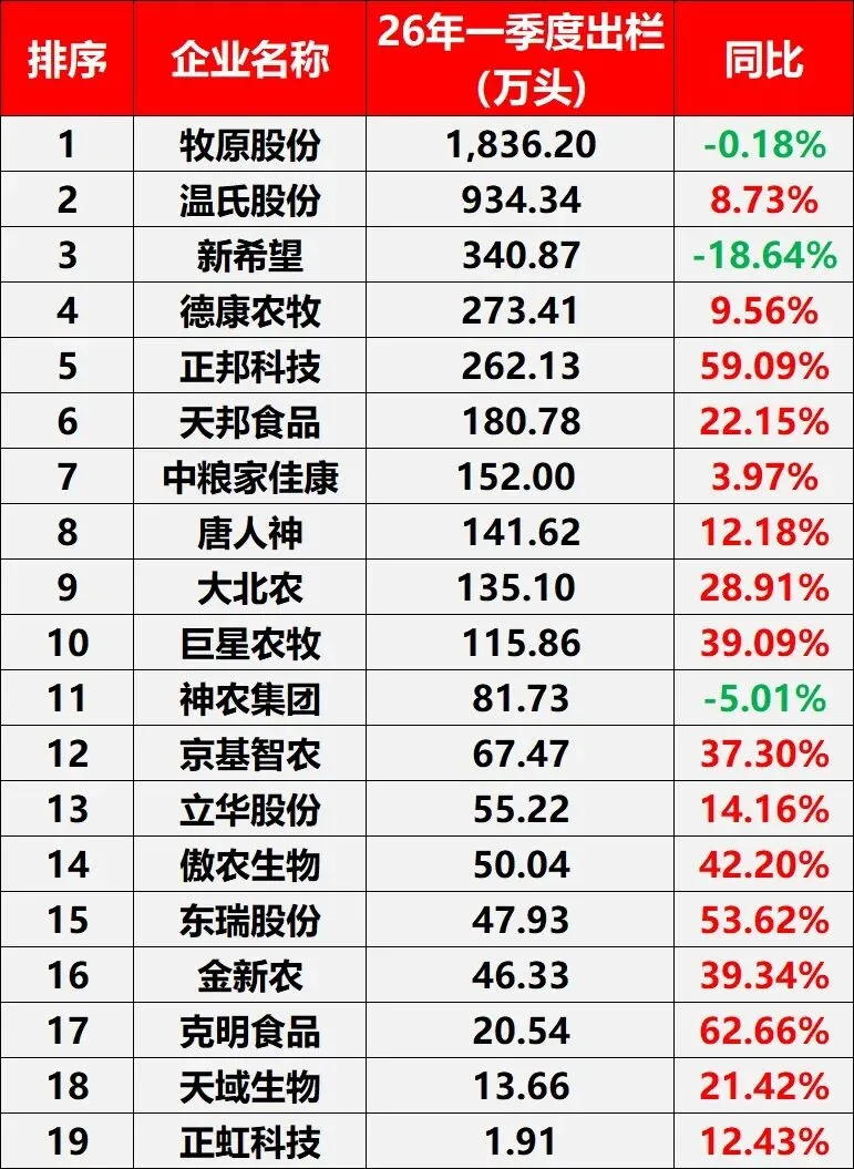 从整体格局来看,一季度19家上市猪企中,15家实现生猪出栏量同比正增长,占比超83%。高增长的出栏量与2025年3-5月能繁母猪高位存栏形成精准对应,是前期产能布局的传导结果,也直接加剧了一季度生猪供给过剩的格局,为猪价持续低迷奠定了基础。?