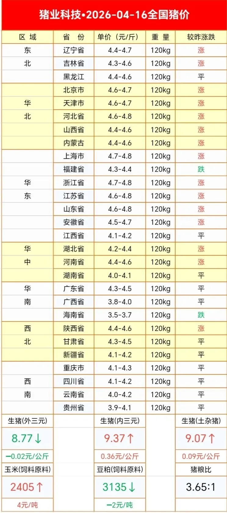 2026-04-16明日猪价 养羊网 2026-04-15 2026-04-16明日猪价? ?别忘了点个在看哦? 养羊网 2026-04-15 上一篇:【明天猪价】2026.4.16全国猪价 (已更新) 下一篇:猪企一季度产销观察:猪价下探之下行业分化明显,头部企业出栏谨慎 您可能还会对下面的文章感兴趣111: 相关文章 生猪行业大地震!国家三连重拳出击 1月30日全国鸡蛋价格 近期价格更新!!! 2025年3月8日全国鸡蛋价格,鸡苗价格