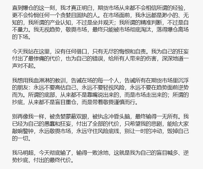 说实话,下午打开微信,就看见群里那篇疯传的《各位产业内外的朋友,我是一个失败者》的忏悔书。写得那叫一个声泪俱下,说什么“抄底在半山腰”、“被期货市场碾碎”,看得我心里一紧。