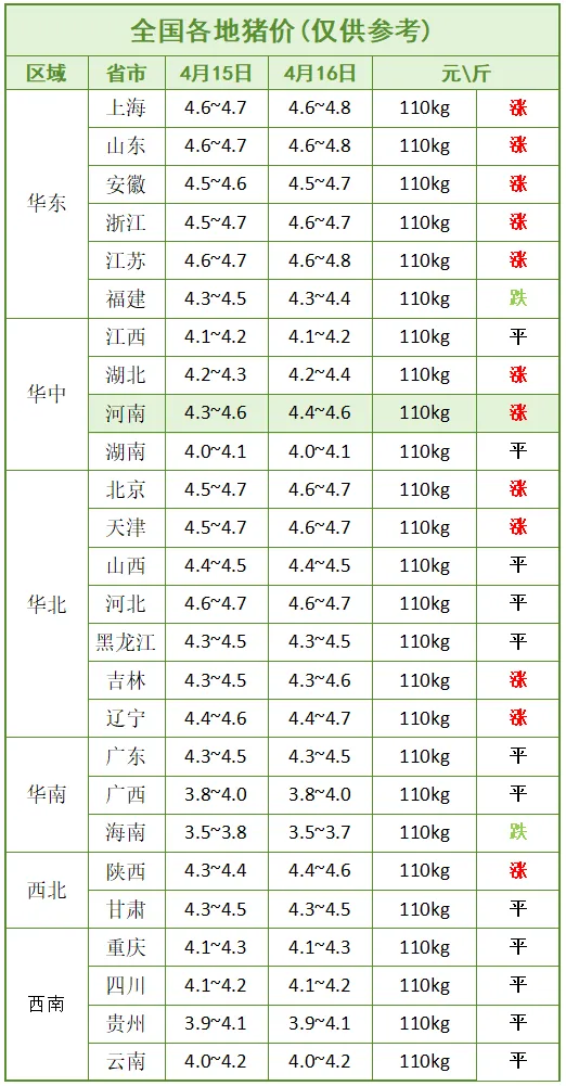 | ? ?4月16日猪价呈现局部上涨、南北分化态势:华北、华东多数省份价格回升。养殖端抗价缩栏、二次育肥入场、五一备货预期带动需求小幅回暖。 |