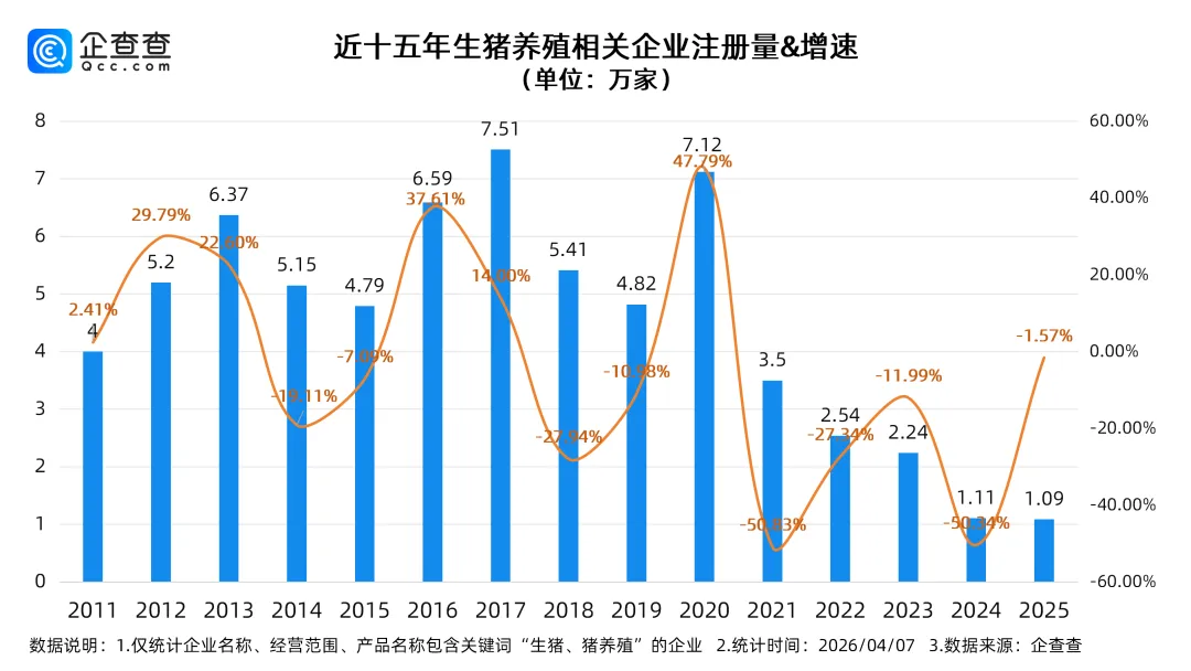 生猪养殖作为民生刚需行业,其景气度与市场主体进退高度绑定。企查查数据显示,截至2026年4月9日,年内新增生猪养殖相关企业注册量仅0.21万家,行业依旧处在低位修复阶段,市场信心尚未完全恢复。?