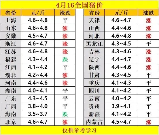 2026.4.16.——明日猪价预测 养羊网 2026-04-15 2026.4.16.——明日猪价预测 养羊网 2026-04-15 上一篇:【农阳农牧】2026-4-16猪价早知道 下一篇:26.4.16鸡蛋毛鸡价格 您可能还会对下面的文章感兴趣111: 相关文章 猪价4元、仔猪暴跌后还能养吗?超10省养殖户慌了! 2026年4月2日 全国产区鸡蛋价格稳定,预计节后价格大概率走低! 近期价格更新!!! 2026年4月5日猪价报价信息!