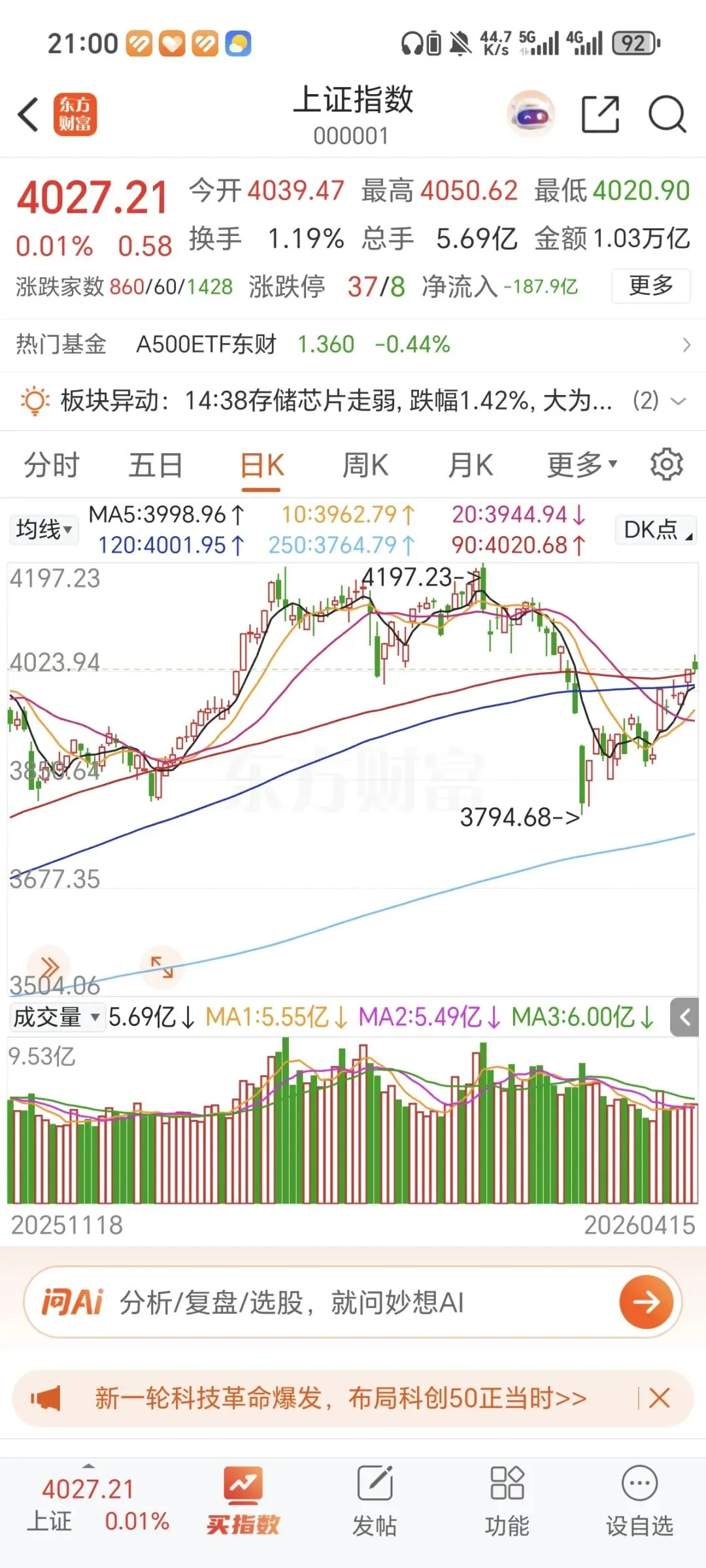 在受到国际原因影响指数没能摆脱4100点之后急跌400点,现在又到了试探4100这个关键区间的时候,不可掉以轻心,这里需要走出一个缺口更能判断