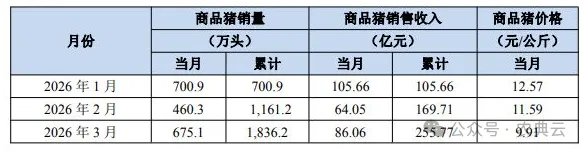 牧原股份今年一季度累计销售商品猪1836.2万头,相较2025年四季度的2065.8万头,环比下滑11.11%;一季度实现销售收入255.77亿元,相较去年四季度的293.88亿元,环比下降12.97%。