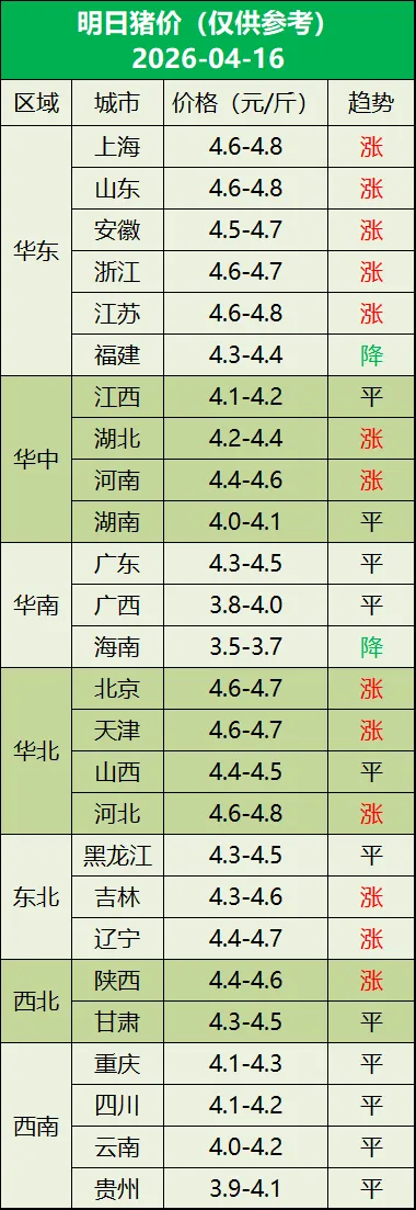 明日猪价(2026年04月16日) 养羊网 2026-04-16 明日猪价(2026年04月16日) 养羊网 2026-04-16 上一篇:【明天猪价】26.4.16 全国猪价(大面积上涨)! 下一篇:小幅上涨!!4月16日猪价 | 多地小幅上涨,节前能涨一波? 您可能还会对下面的文章感兴趣111: 相关文章 利润惊人的8个冷门行业 2025年4月13日全国各地生猪价格信息 在猪场打工还债的第23天 2025年4月13日全国各地生猪价格信息