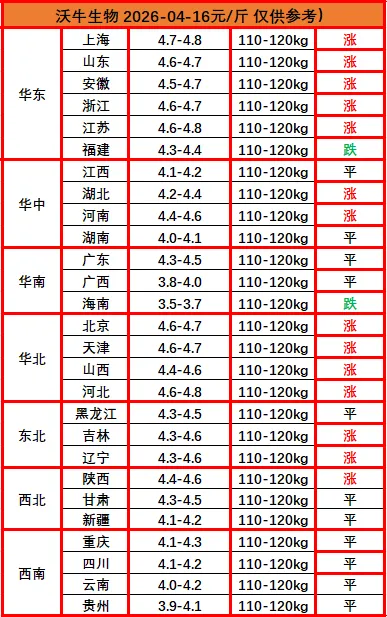 ? ? 猪价播报沃小牛,助力养猪牛牛牛!各位养猪的老铁们,大家好!我是沃小牛,明天是2026年04月16日,最新猪价已经出来了:明天全国生猪价格延续涨势,涨面覆盖超七成,多地报价突破4.4元/斤,仅海南、广西等少数区域维持低位。山东、江苏、浙江等主产省报价集中在4.6-4.8元/斤。此次上涨并非消费端驱动,核心源于规模场控量惜售、散户集中出栏后供给阶段性收缩,叠加期货市场领涨带动情绪修复。但需警惕:当前淘汰母猪与肥猪价差仍处历史高位,产能去化滞后,供给过剩本质未改,上涨持续性存疑,短期或呈“脉冲式反弹、难持续走高”格局。
