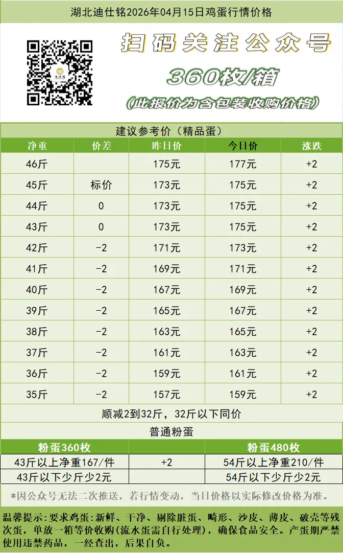 湖北迪仕铭2026年04月15日鸡蛋行情价格 养羊网 2026-04-16 湖北迪仕铭2026年04月15日鸡蛋行情价格 养羊网 2026-04-16 上一篇:【一箱蛋】4.16-全国鸡蛋价格与供求信息!(稳定为主!) 下一篇:【养猪行情】2026.04.16-猪价行情! 您可能还会对下面的文章感兴趣111: 相关文章 福州 真野猪肉还是杜洛克公猪? 近期价格更新!!! 【超前猪价大预测】1月10日~1月13日!全国猪 【1月12日】全国各地鸡蛋价格—主流价格多数继续上调!